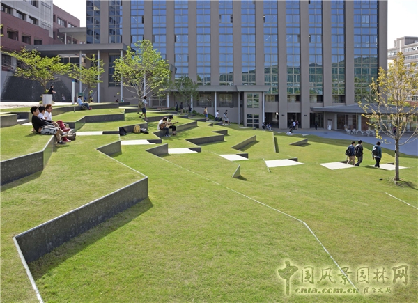 中央廣場、梯田景觀、北大街之間沒有不協調的元素,它們共同在校園的開放空間中形成一個景觀,這就是為什么九州產業大學的景觀設計是很好的例子。