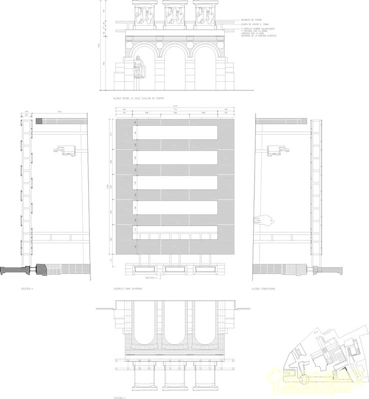 花園的整體翻新將會保留現有的出入口,只不過在入口處會設計一個鋼架結構的門廊。此外,花園翻新后將會增加兩個出入口,一個緊挨著插畫博物館,通過拆除一些多余的舊墻而拓展出來。另一個出入口的位置比較重要,就開在醫院臨街處,當然這個口也通向花園和圖書館,用于連接的坡道鋪得非常平緩。