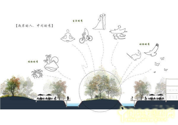 化樹為島。保留河堤22組樹的群落,改造為河心綠島,實現“雙河伴流”、“三河并流”的自然河道形態,提升水陸兩棲生物多樣性,為沿河兩岸群眾提供了22座動植物演繹的舞臺。
