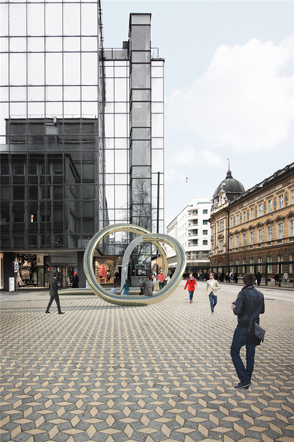 管狀結(jié)構(gòu)能夠映射出緩緩地流水,內(nèi)折曲線空間循環(huán),構(gòu)造成一個(gè)座位區(qū),供人們休息。設(shè)計(jì)師描述:“這件‘水雕塑’具有獨(dú)特外觀,努力為現(xiàn)存的復(fù)雜空間增加現(xiàn)代層次感,而不是與周?chē)h(huán)境形成競(jìng)爭(zhēng)關(guān)系,因此這件雕塑變成一個(gè)明顯的標(biāo)志,一件城市的珠寶,可以作為城市地標(biāo)。”實(shí)際上,這件雕塑既具有藝術(shù)感,也具有實(shí)用功能,通過(guò)公共藝術(shù)方式,實(shí)現(xiàn)兩條相鄰街道一體化。