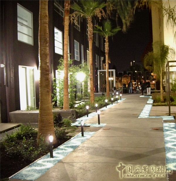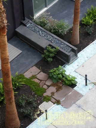 餐廳庭院,道路兩側的雨水收集槽中填充著回收的玻璃
