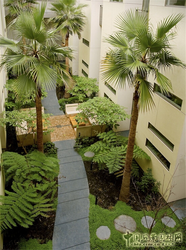 起居室庭院設置了混凝土制的椅子和矮桌,可供居民聚會交流。山茱萸,曼陀羅和杜鵑花郁郁蔥蔥,還映襯著黃金箱根草。