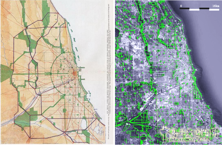接下來是一個芝加哥的城市規劃,可以看出來城市規劃的連續性非常重要。一百多年前的芝加哥城市規劃,和今天的綠地布局幾乎是可以完全對上的。一百多年以來,整個城市的規劃設計非常連貫,在城市中看不到大的綠地,綠地的特點是小而多,這實際上是密集型城區非常重要的空間格局訴求。