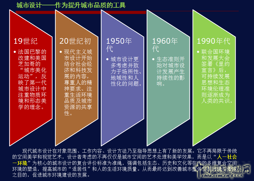 從19世紀、20世紀,一直到今天,城市設計已經發生了很大的變化,它必須要跟人的需求,和社會經濟環境融成一個總體,形成一個人、環境為核心的領域。