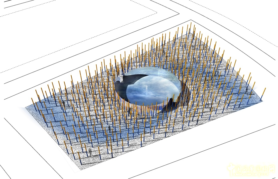 平園,以“平”為趣?;▓@四周竹竿林立,中央為兩片不銹鋼鏡面墻,環形交錯圍合成圓形水院。院中有直道,平水橫貫,與院外“竹林”中的兩條弧形園路相連,貫通花園內外。花園平面形同太極,空間結構簡潔。全園地形北高南低,但竹竿、鏡面墻的頂高全部取平,構成絕對水平的頂界面。園路敷以藍色卵石,鋪地則全用白色卵石,每根竹竿上、下分別飾以黃、藍兩色,放眼望去,如藍色音符跳動起伏,形成模糊的“地平線”。