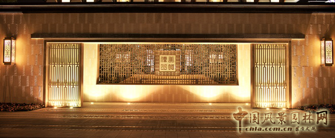 穿過框景格柵轉(zhuǎn)進第二進庭院,銅質(zhì)宮燈營造迎賓序列;LOGO銅板鑲嵌的地面與陽光下斑駁的竹影交輝,猶如筆意生動的留白水墨。