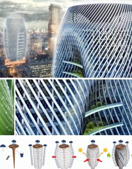 如何讓建筑在最大程度上收集雨水?H3AR設計的集雨摩天樓可能給出答案。借助于覆蓋整個外部的水槽網,雨水將直接流入一個處理廠。處理后獲得的生活用水可用于沖馬桶、洗衣服、其他清洗工作以及澆灌植物。根據H3AR的設計,摩天樓的皮膚與屋頂上一個巨大的碗狀雨水收集設施結合在一起,在最大程度上獲取雨水。