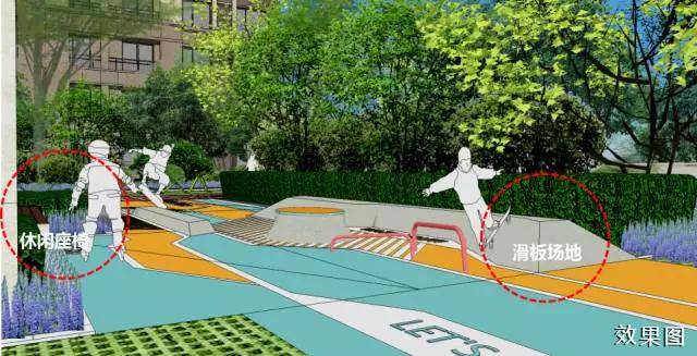 值得一提的是,九墅還設計了約90㎡的極限運動空間,主要提供給輪滑和滑板愛好者使用。按照特定標準設置的陡峭坡度再加上高低起伏的極限運動障礙設施,提升了運動的趣味性,使運動者感受極速帶來的刺激。設計者獨具匠心地將場地鋪裝的色彩明麗,并在地面標注提示、鼓勵性的文字,營造運動氛圍,這樣的設計更多的是想讓青少年在運動的過程中超越自我,感受參與、娛樂和勇敢精神。