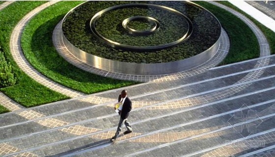 這是一家公司大樓前的場地設計,設計的特別之處在于一組平行線與一組同心圓相交。直線是開放的,代表發射;園是封閉的,代表收縮,二者相交產生了聯系,引人思考。從這我們可以聯想到宇宙的結構,即宇宙是開放的還是封閉的,或許它既是開放的又是封閉的,就像薛定諤貓,就像這里的平行線和圓環,在某處魔幻地交切。