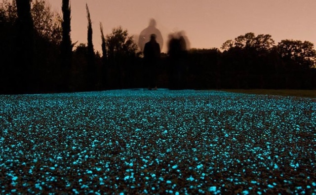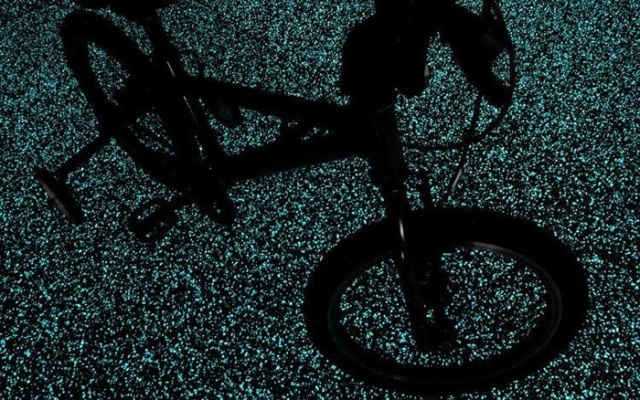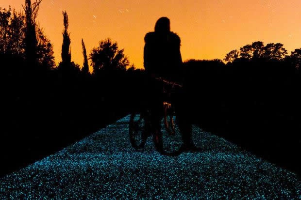 荷蘭埃因霍溫市(Eindhoven)的郊外,有一條600米長的自行車道。每到夜晚,道路會變得非常漂亮:成千上萬顆小石頭發著藍綠色的微光,如同銀河星空灑落人間般往前蜿蜒,在這條路上騎行,有一種置身夢境的浪漫。