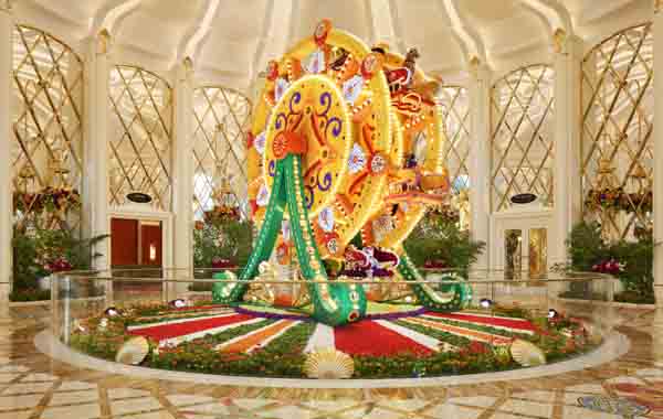 “人們總是在問我,做花藝怎么能這樣,我的回答是,為什么不能是這樣?”普雷斯頓在回復第一財經的郵件中寫道。“花卉和草植雖然有它本身的形態,但只要善于運用和組合,它們的變幻潛力遠遠超出你的想象。”他還用10.3萬朵紐扣菊和小玫瑰,在酒店的另一頭北庭院大堂打造了一輪旋轉的“摩天輪”。