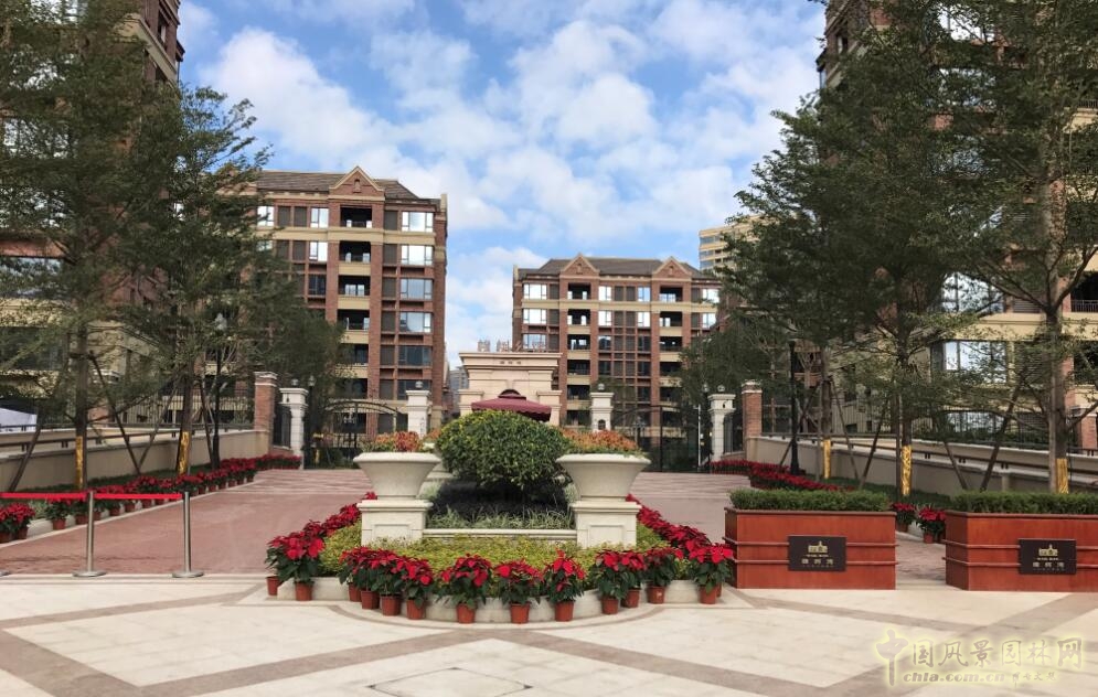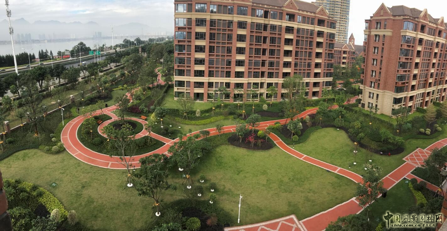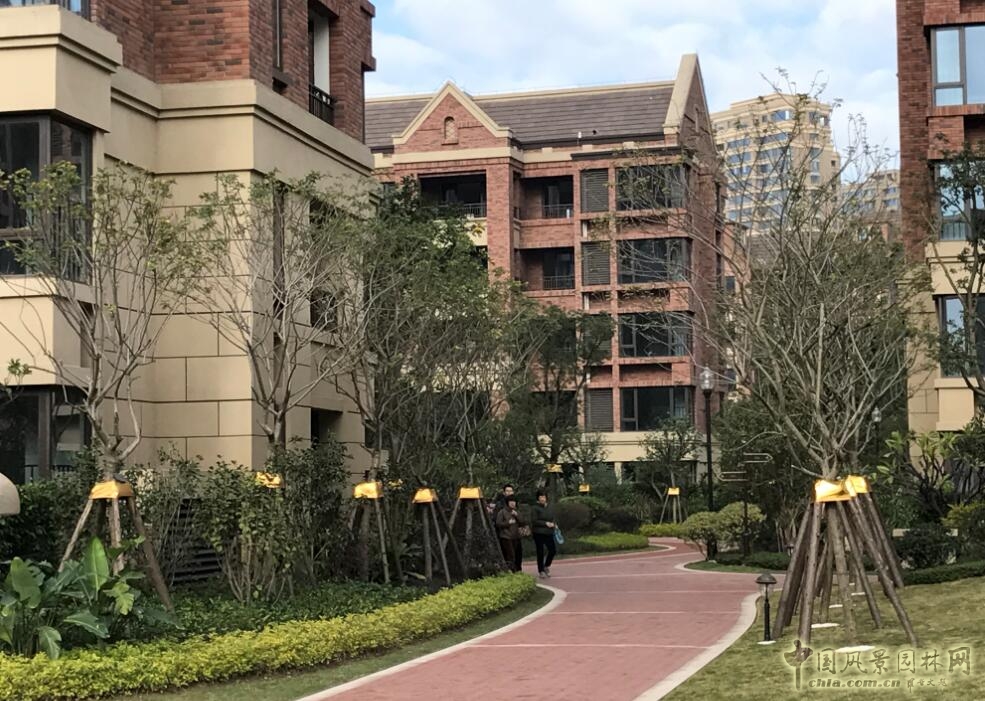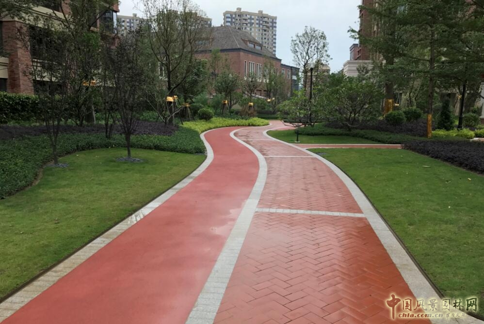 在整體景觀布局上,以自然造坡,綠化造景為主,硬質景觀與建筑設計相協調。南入口及中軸線通過兩側對稱的同規格的小葉欖仁、香樟以及黃花槐層次樹陣作為主要的小區景觀路線指引,噴泉跌水、形狀各樣的花池、花缽及種類各異的路沿石圈邊彰顯出小區的尊貴與大氣,噴泉跌水四個等分角的方向上各點綴了一株冠幅及高度恰到好處的香泡,樹干裝飾呈貴金色,在紅磚與石材的海洋里,突出著小區的與眾不同。小區的中部設計了紅色的環形塑膠健身步道、實木構成的景觀休憩廊架,給業主提供一個放松身心的場所;中心廣場東西兩側分別矗立著天使雕塑和規格精致的小型水景,廣場中部大面積的休閑草坪被四周紅白相間的人行步道包圍,在滿足行人休息的功能要求下,給園區增添了一絲愜意。