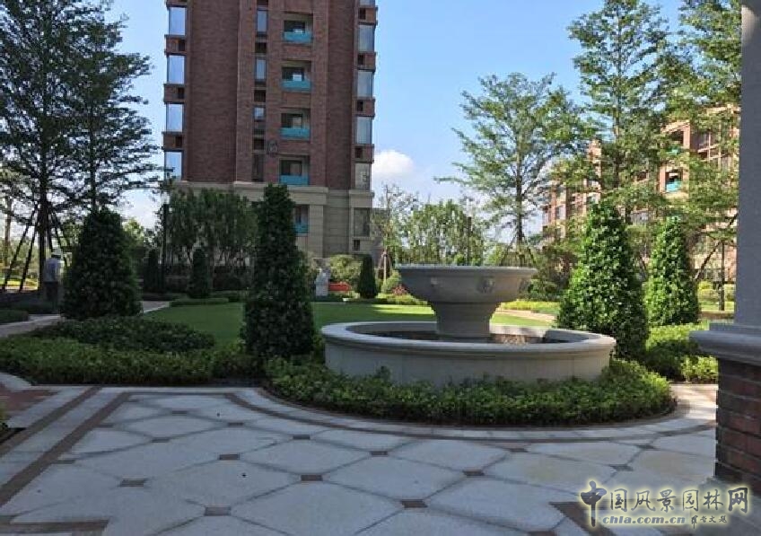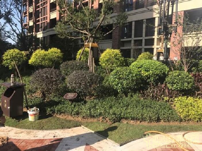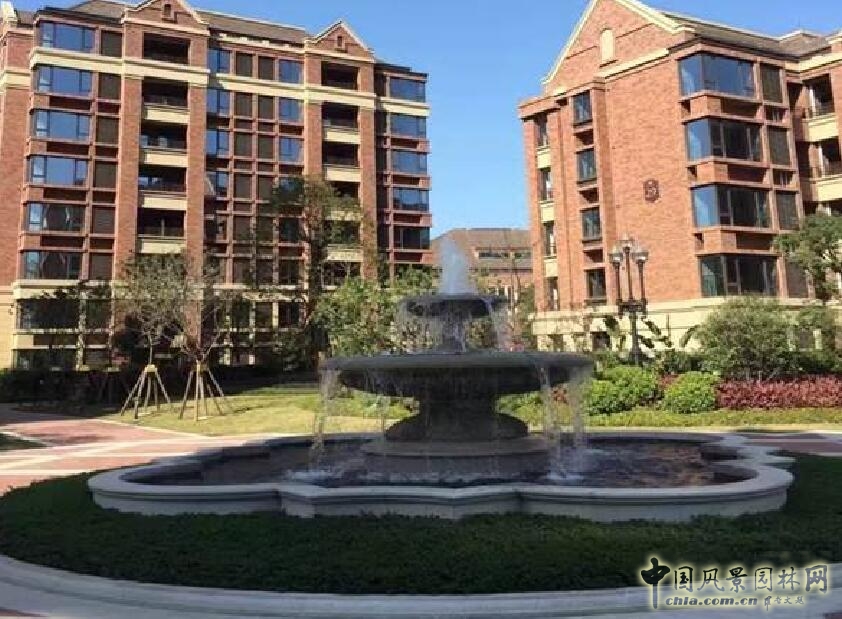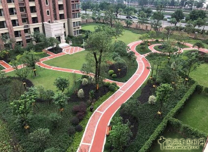 園區東北側設有以藍、黃、紅為主要色調的兒童活動及成人健身的場地,藍色與黃色搭配的橡膠地墊之上,放置著一座大型的兒童滑梯設備,四周設計了搖搖樂、太空漫步機、單雙人坐凳、三人轉腰器等娛樂健身器材,在兒童活動場地北部為一個直徑約6米的沙坑,沙坑內固定著一座直徑約3米的轉盤,供小區內的小朋友娛樂玩耍。園區內人行步道以紅色燒結磚為主要鋪貼材料,局部廣場及入戶平臺區域鋪設以蝦紅為主要品種的花崗巖石材,整個鋪貼風格清新有致,使行人在行走觀望過程中能逐漸感受紅白相間色調搭配的良苦用心。圍墻面層采用與建筑主體一致風格的紅色仿古磚,使景觀與主體步調統一,局部使用黑色船殼漆上色的鐵藝欄桿作為圍擋,風格輕盈,入戶平臺兩側設置的無障礙坡道路面用米黃色石材鋪裝,扶手顏色統一于鐵藝圍墻,扶手基座石材海棠角收口,方顯整體石材的鋪裝工藝水平。軟景部分則以中層灌木為主力軍,挑選顏色及冠幅上佳的黃金榕球、灰莉球、銀姬小蠟球、紅葉石楠球等點綴于各個景觀主要節點,恰當的色彩搭配給人以耳目一新之感。