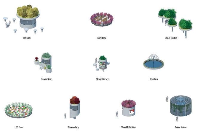 MVRDV將首爾本土植物與圓形花盆結(jié)合,打造出一個獨特的綠色空間;再將一系列城市公共空間活化劑要素比如茶餐廳,花店,自由市場,圖書館等植入其中,力求讓場所變得更有生機(jī)與可能性。與此同時,這座美麗的天橋在蔓延的過程中還衍生出系列分支,與周邊的綠地和公共空間相聯(lián)系,極大的帶動周邊城市活力與豐富性。