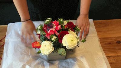 7.放在包裝紙中間,調(diào)整包裝紙,包起用繩子扎住