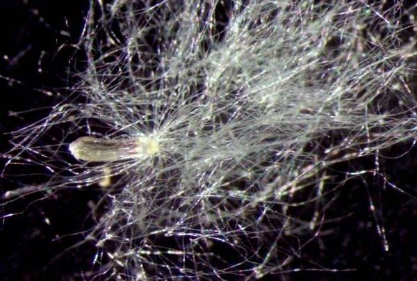 比雄花稍晚一些時(shí)期,雌株上的雌花開始開放,伴隨著雌花序的發(fā)育成熟,雌樹上鮮嫩的幼葉也開始慢慢地長出來。雌花序是由若干朵小花組成穗狀的葇荑花序,每一朵小花發(fā)育后長成一個(gè)小蒴果,小蒴果里面包被著白色絮狀的絨毛,在絨毛中間藏著一些像芝麻粒大小的由胚囊發(fā)育而成的種子,隨著小蒴果及種子的不斷發(fā)育成熟,小蒴果逐漸裂開,那些白色絮狀的絨毛便攜帶著種子漫天隨風(fēng)飛散,試圖傳播繁衍下一代,擴(kuò)大她們的家族成員,這種現(xiàn)象就是前面我們所說的“楊柳飛絮”。