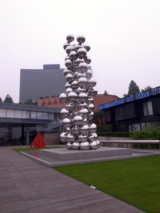二號博物館由法國著名建筑設(shè)計大師讓·努維爾操刀設(shè)計,在全球首次采用腐蝕不銹鋼和玻璃建造,建筑物色彩與地面色彩和諧一致,給人一種沖破地表拔地而起的感覺。在這個設(shè)計中他首次使用了與以往效果不同的"生銹的不銹鋼"材料,他做了很多實驗才得到這個材料。整個建筑上下采用生銹的不銹鋼鋼板,中間是一條貫穿四周的玻璃墻,一層有一個下沉式的庭院。館中展示的是韓國本土和國外的現(xiàn)當(dāng)代藝術(shù),每個展品都有自己的展示空間,并且可以從玻璃墻中獲得自然的光線。館內(nèi)的很多珍藏品也是近年才買來的,其中包括很多后現(xiàn)代藝術(shù)家的代表作品。
