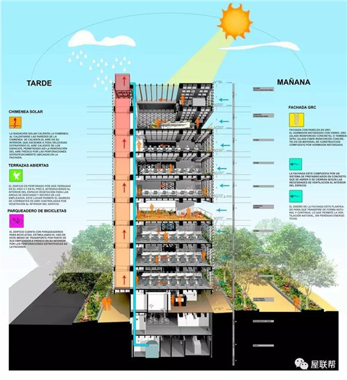 這個設計,通過預制的外墻系統、太陽能電池板、太陽能煙囪、溫度校準、熱浮力,以及不使用空調,代表了對麥德林可持續建筑創新的嚴肅承諾。