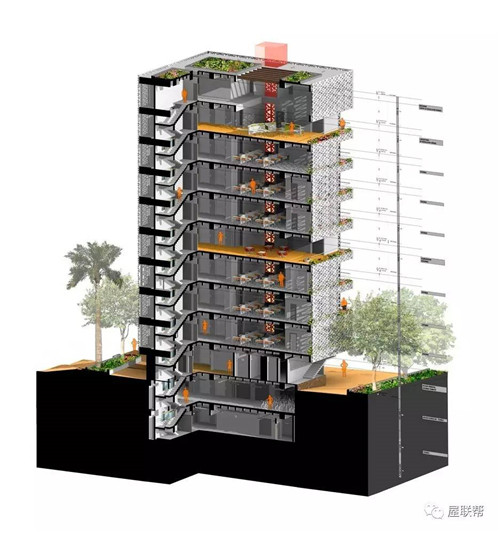 建筑物有兩層地下室,里面的多功能區包括水倉儲、停車場、機房室、回收利用、垃圾、維護和儲存室。一樓是為滿足社區需要而設置的支付中心、前臺、項目展覽館、社區服務和歸檔區。
