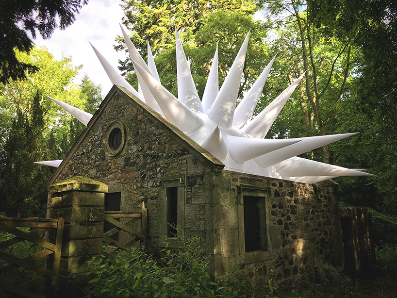 作品scattered是一系列巨大的球體,它們就像是不透明的氣泡一樣漂浮在湖面上,成為mellerstain最著名、最讓人印象深刻的景觀之一。這些球體的直徑達到4米,它們打破了湖面原有的平靜,它們的大小、表面和顏色都讓人印象深刻。作品pointed位于一棟長期沒有斜屋面的房子里,它從屋面輪廓里伸了出來,28個長長的尖角伸向空中,每一個長度都超過了3米,整體看上去就像是星爆的樣子,又像是程式化爆炸過程中的一個瞬時狀態。最后,作品towered是一系列8米多高的圓柱體,外形的靈感來自于一座舊洗衣房廢墟的弧形墻面。
