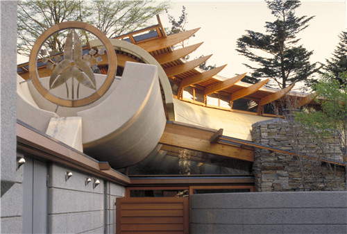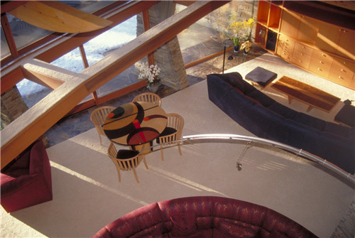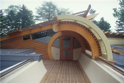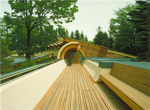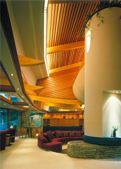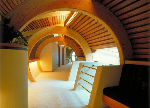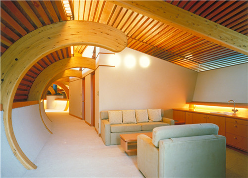 帶廣地區(qū)容易發(fā)生地震。為了幫助抗震,膠合層壓梁設計成彎曲的元件,這也使得天花板、墻壁和地板之間的界限變得模糊。