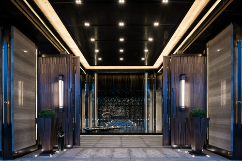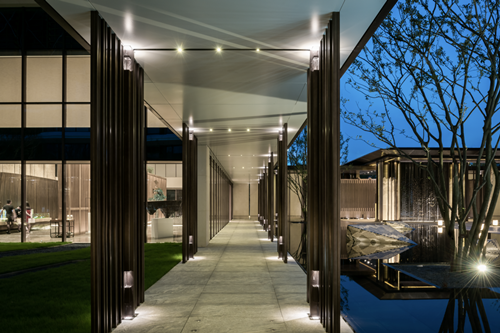 以頗具震撼力和昭示感的形象界面,產生話題性的記憶點,,富有儀式感。入口兩側的夾絹玻璃屏風為虛,屏風后襯的景墻和銅門為實,配以燈光渲染,虛實之間留人以遐想。此外,夾絹玻璃、灰木紋大理石皆為室內材料室外化的一次嘗試,亦拔高整體價值感。