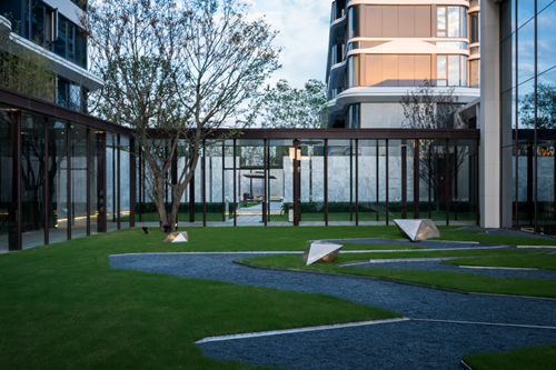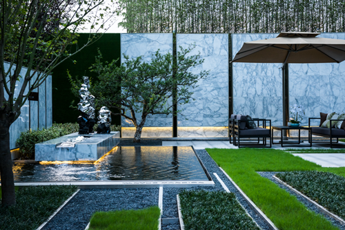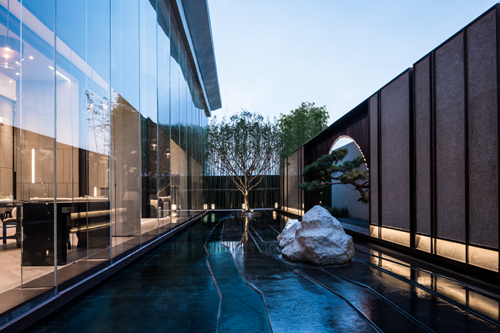 后院的山石、松樹、半圓拱門與地紋,基于宋代美學打造,回歸到傳統園林的趣味,又融入現代化建筑之中,帶有某種程度的現代性,整體視覺更立體。