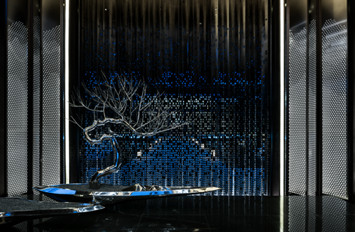 照壁首先需要防止不銹鋼板因為激光穿孔而變形,同時穿孔后還需要折出不同寬度、不同角度、折邊挺括的照壁,工藝要求極高。為保證兩側山紋穿孔屏風導光均勻,首次嘗試使用導光亞克力板。