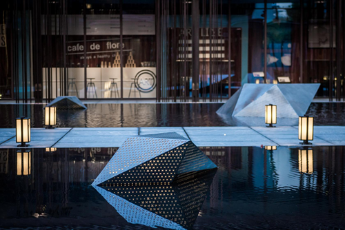 多種材質的碰撞——入口水景雕塑的山水情節