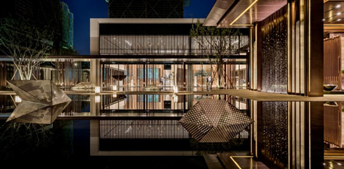 水院中庭的中軸如橋一般浮于水面之上,定制風燈立于兩側,極富序列式的儀式感,似乎在迎接您歸家。傍水造園,四周回廊圍合,恰似玲瓏的江南水院。雨夜漫步于回廊,讓人感受到空間的尊貴與包容,幾何雕塑立于水上似山似石。