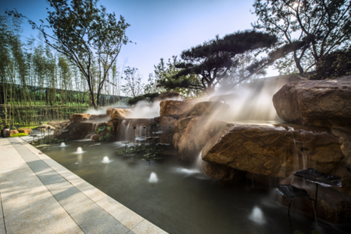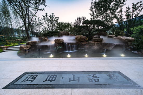 鴻坤·山語墅后園,特置水霧景觀,煙水彌散于月光下,自在飛花無邊絲雨,輝映燈光,如夢如幻,此身不知是在北方還是已處江南。