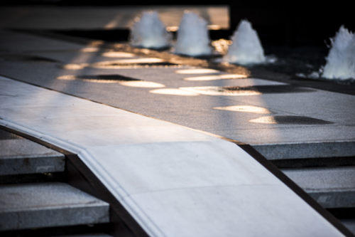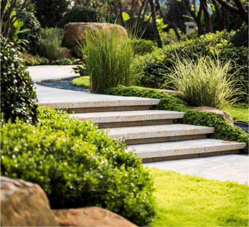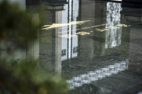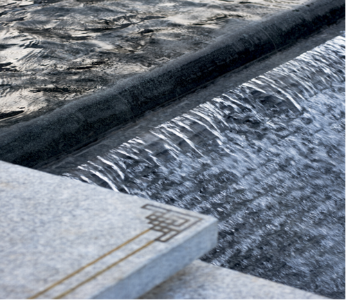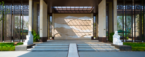 魯灰與雪花白御道的搭配,再加上銅質的金屬線腳,景墻三層石材有厚度和延展度的變化,大尺度不失小細節,精致突顯奢華。