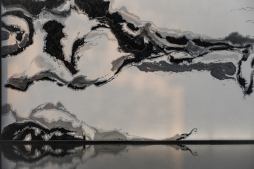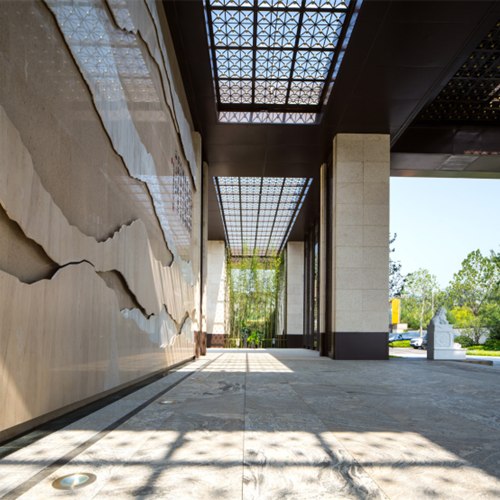 燦爛的陽光投射在墻上,大殿中,一覽江山。談笑間,悠然自得。地面石材,魯灰與雪花白御道的搭配,再加上銅質的金屬線腳,低調不失奢華。入口高大的對景墻六米高,詩詞加上抽象的群山意向,有層次有調性。三層石材有厚度和延展度的變化,在黃色系木紋石下統一,基底干掛金摩卡、面分層分別為金沙木紋和法國木紋的變化。門當石獅子、戶對圖騰,古建新制,具象到抽象,不變的是其象征的意義。