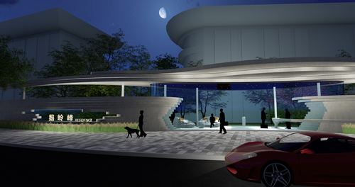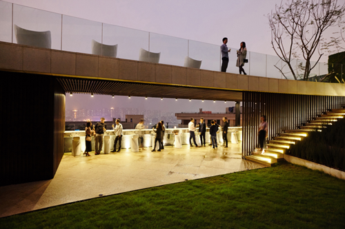 設(shè)計延續(xù)弧形建筑優(yōu)美的線條,在室外重構(gòu)了交通體系和功能空間。新的景觀功能把建筑退臺的形式延伸到室外,形成觀景平臺,并且遮擋住了一些建筑設(shè)施并不美觀的細(xì)節(jié),比如風(fēng)井、采光井等等。