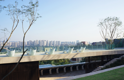 室外空間并不富余,但室外最美的景觀就是把城市的美景盡收眼里,大有一覽眾山小的氣勢。我們想把這樣的景色深刻的留在人們的感觀當(dāng)中,舒適的空間又能讓人停下腳步。我們用一條安靜的水帶勾勒了空間邊界,它又是連接不同豎向臺地的要素。水帶在視野最佳的地方匯聚開來。此刻,它就像一面鏡子,把天空、城市和環(huán)境倒影在一起。很安靜,讓人充滿想象。