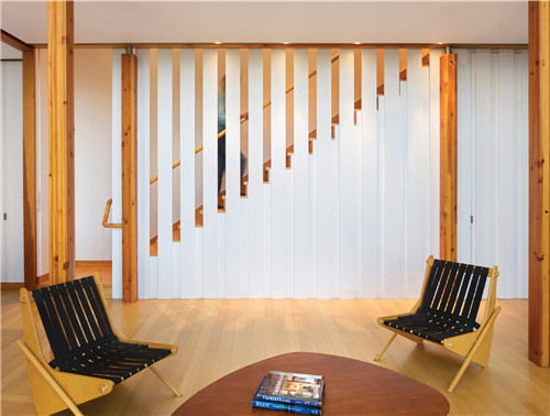 在炎熱的天氣下,延伸的窗口可以通過一系列的卷簾來遮蔽陰涼,即使在關閉的時候一些光線仍然可以通過它們的縫隙進入。盡管它們的材料和顏色相似,但百葉窗的垂直板條與家中的水平面不同。