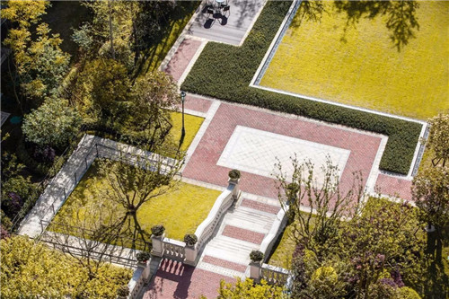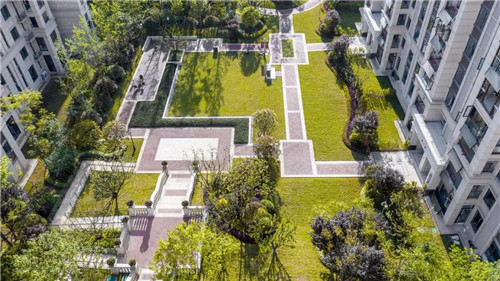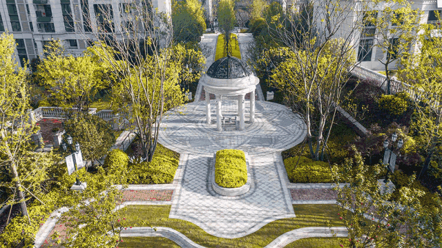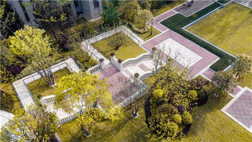 基于法式建筑風格,以草坪,石材共同營造開闊簡約的空間美學景觀。
