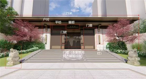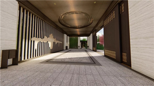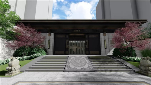 大門(mén)即為禮門(mén),其設(shè)計(jì)遵循中國(guó)古代皇宮和府大門(mén)規(guī)制,以門(mén)頭八儀恭立府門(mén)之儀,門(mén)當(dāng)、戶對(duì)、平枋、匾額、門(mén)扇、門(mén)鈸、燈籠、門(mén)檻,細(xì)琢精雕,卓立世家風(fēng)范。從彰顯世家門(mén)第的門(mén)當(dāng),到象征身份地位的戶對(duì);從寓意家族興旺的燈籠,到光耀世家的門(mén)楣;從大方之家的門(mén)鈸,到恢宏厚重的大門(mén);從書(shū)有“洺悅府”的匾額,到全新設(shè)計(jì)的門(mén)檻。洺悅府大門(mén),以門(mén)頭八儀彰顯世家氣度,傳承國(guó)戶之禮。