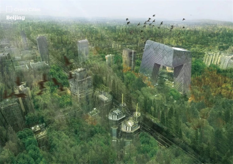 對(duì)于城市,Maas 充滿了單純的奇想——他想要?jiǎng)?chuàng)造建筑體完全被植被覆滿的沉浸式“綠色城市”——“喧鳥覆春洲,雜英滿芳甸”。在他的暢想之中,城市中間應(yīng)該有一個(gè)叢林,有一些玻璃建筑外立面等等,并放進(jìn)一些足夠承載夢(mèng)想的事物。于是,他們不斷從原來的廢墟當(dāng)中挖掘新的元素。“我們需要在屋頂和高層建筑布置綠植。花草樹木幫助降低二氧化碳排放,為城市降溫,并促進(jìn)生物多樣性。”他展示了一系列在胡同、城市CBD等處布滿綠植的效果圖,將最多樣化的植物群體引入復(fù)雜的城市環(huán)境中,仿佛能使居民沉浸在大自然奧妙中而出神發(fā)呆,如富有詩(shī)意的瓜拉尼神秘主義,將鳥鳴歌唱與草木悲嘆置入城市盒子之中,然后交至我們手中。他認(rèn)為建筑師要在科幻和現(xiàn)實(shí)之間找到平衡點(diǎn):“有一些是科學(xué),同時(shí)有一些是幻覺,我們作為建筑師應(yīng)該在這兩點(diǎn)之間實(shí)現(xiàn)平衡,所以MVRDV 成員當(dāng)中有人在洛杉磯做電影制片人,同時(shí)我們又是建筑師。”