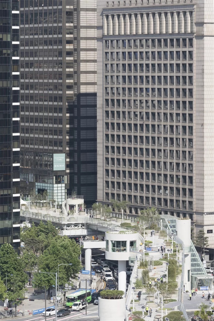 為了實(shí)現(xiàn)“綠色”目標(biāo),他們與一些植物研究所展開合作。在首爾空中花園項(xiàng)目中,他們擇取了200多個(gè)韓國(guó)本土品種的樹木,以生動(dòng)的植物百科形式,向公眾展示了韓國(guó)自然遺產(chǎn)的部分精華。MVRDV 的設(shè)計(jì)將這座老舊的公共設(shè)施改造為一座全新的綠色地標(biāo),期望未來作為催化劑推動(dòng)城市的綠化。在未來,隨著植物生長(zhǎng)更為繁茂、部分植物可遷居至城市其他角落,使得綠意從固定地點(diǎn)解放。Winy Maas 說,“所有植物被種植于不同大小和高度的盆栽,以不同科目來組織,通過韓文字母排序,形成別具一格的空間形態(tài)。”各種樓梯、電梯、人行橋、手扶梯等設(shè)施將空中花園與城市連接起來,與周邊的城市肌理形成彈性關(guān)系。夜幕降臨時(shí),空中花園將被藍(lán)色的燈光點(diǎn)亮,仿佛夜晚城市的一條河流。