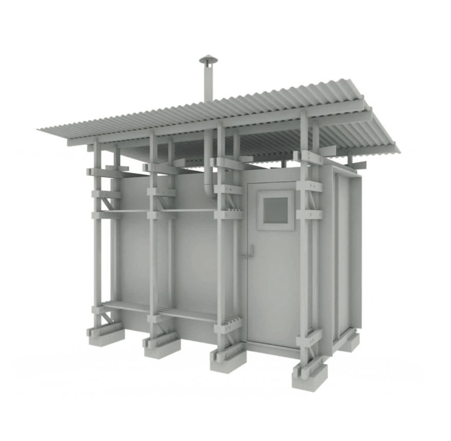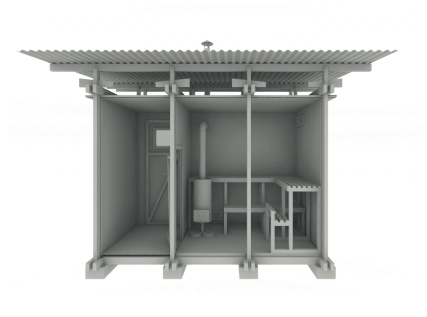 The rectangular floor plan is divided into an entrance area and the sauna room in a ratio of 1:2. The integrated seating and storage spaces on the outer structure offer additional qualities. An inviting entrance door with a small window leads to the changing room including hangers and a bench. A lower door connects the entrance room to the sauna, the low doorframe prevents hot air from escaping. This room is illuminated by two fixed windows and can be ventilated by the help of two ventilation flaps. One flap is mounted low behind the oven for sufficient oxygen supply and the other one is located on the opposite wall below the ceiling to regulate the exhaust air. The floor is made out of concrete panels which on one hand weigh the whole building down and also enable the water to seep through the floor. The L-shaped bench allows the seating on two different levels and includes the granite filled wooden stove. Furthermore, a stainless-steel pipe leads the smoke through the side wall to the outside.