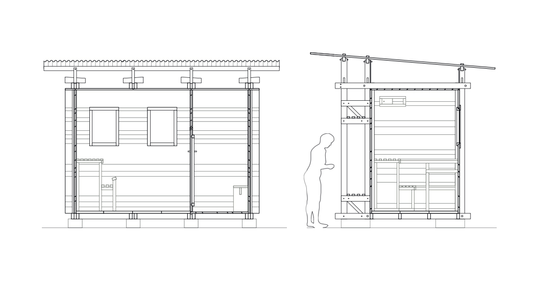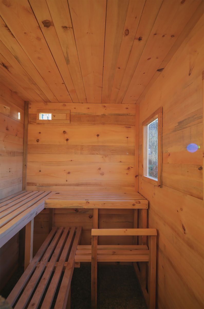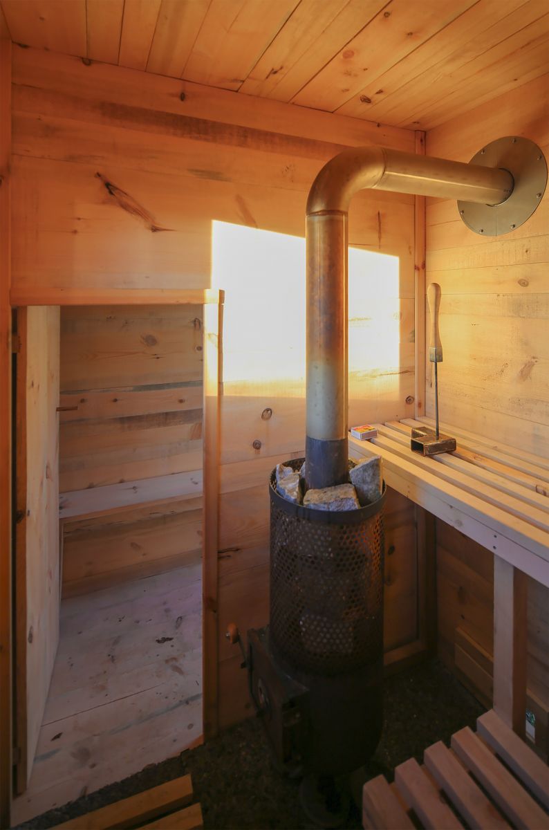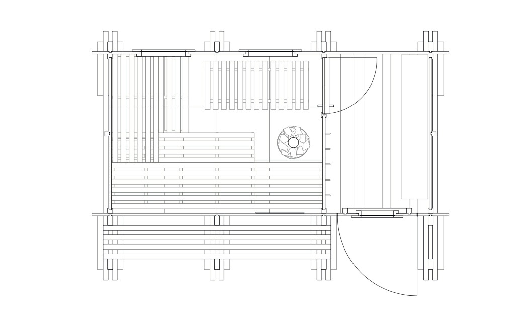 平面圖按照1:2比例分為入口和桑拿室。座椅和儲物空間設置在了桑拿房外部。更衣室設有小窗,屋內含衣架和長凳,另外較低的門進入是桑拿房,這個高度是防止熱氣外散。房間采光來自兩個窗戶,借助兩個通風閥來流通空氣。地板由混凝土板制成,可以整體下壓這個木屋,另外還可以滲水,L形長椅設置成不同的高度,木爐配有花崗巖填充,不銹鋼管將煙氣引到外部。