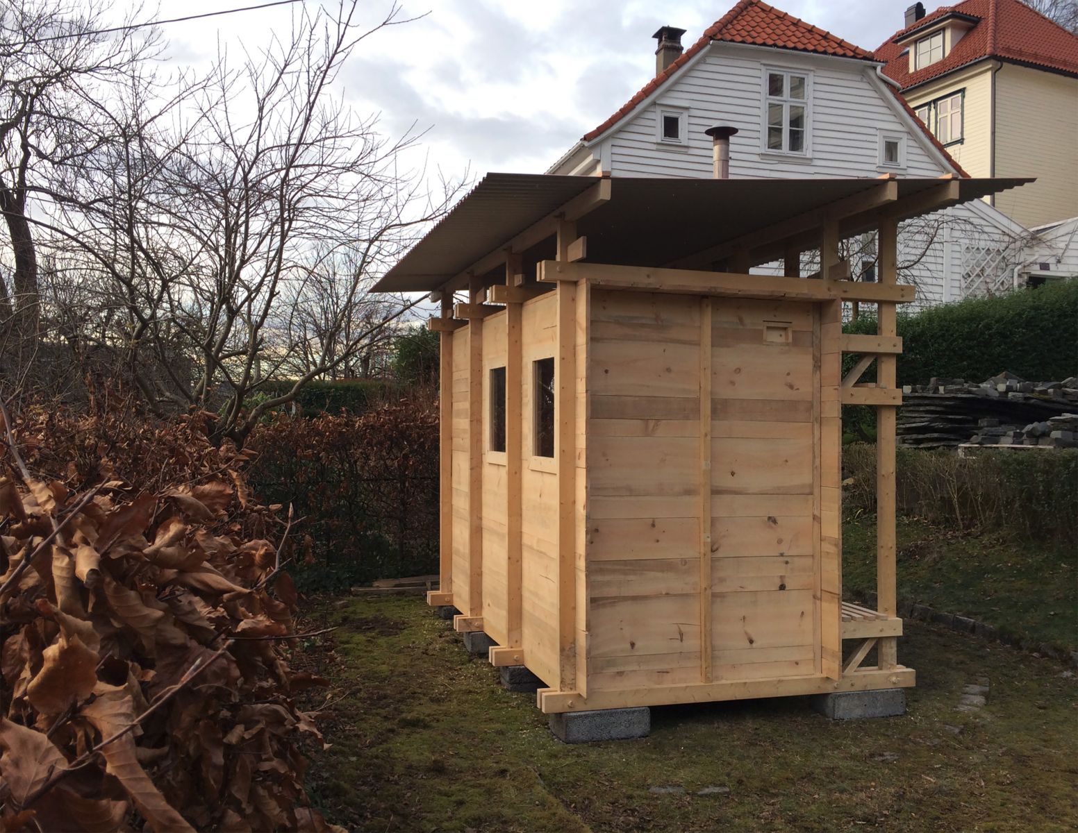 100% wood - As a complete wooden construction, the building is intended to be a furniture and, therefore, uses appropriate joining methods. Instead of nails, screws and glue the main structure is kept together by wooden pegs, wedges and dovetail joints. The sauna consists of a closed core of freshly self-sawn boards, surrounded and stabilized by an outer frame structure made out of dry timber beams. These frames support the lightweight roof made out of reused corrugated metal sheets. The fresh boards are Norwegian pine from the nearby forest on mountain Fløyen. They were sawn into rough-cuts at the Architecture School and later mounted in random widths. The dry spruce of the external structure is standardized timber and also recycled material from a previous task.