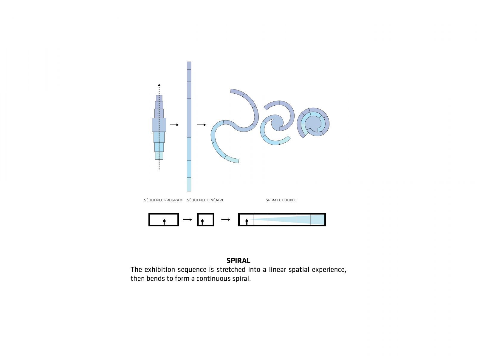 展覽順序被拉伸成線性的空間體驗,彎曲以形成連續的螺旋。