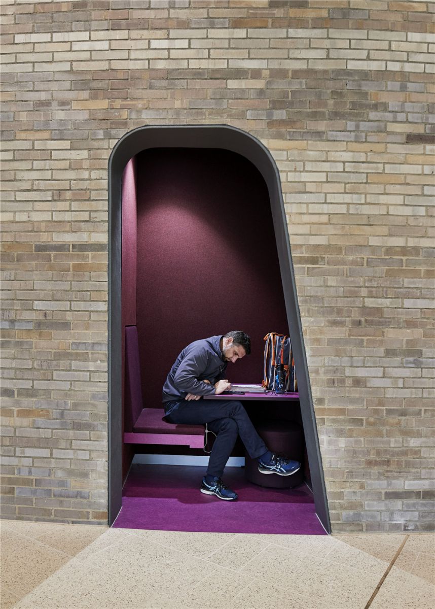 學(xué)習(xí)空間分組成一個(gè)個(gè)小團(tuán)體,并由非正式學(xué)習(xí)社區(qū)提供支持。這些小團(tuán)體將建筑分解成更小、更隱密的環(huán)境,學(xué)生可在此找到獨(dú)處的靜謐空間。