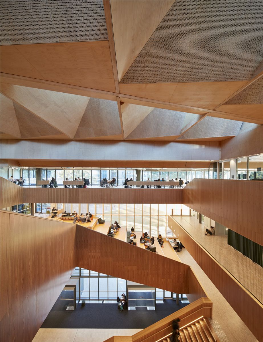 Learning spaces are grouped in clusters and supported by informal learning neighbourhoods. These clusters break down the scale of the building into smaller, more intimate settings for students to inhabit. Streets, courtyards, bridges, balconies and stairs are choreographed into ravines, clearings, strands, nests and amphitheatres to make a landscape of the interior.