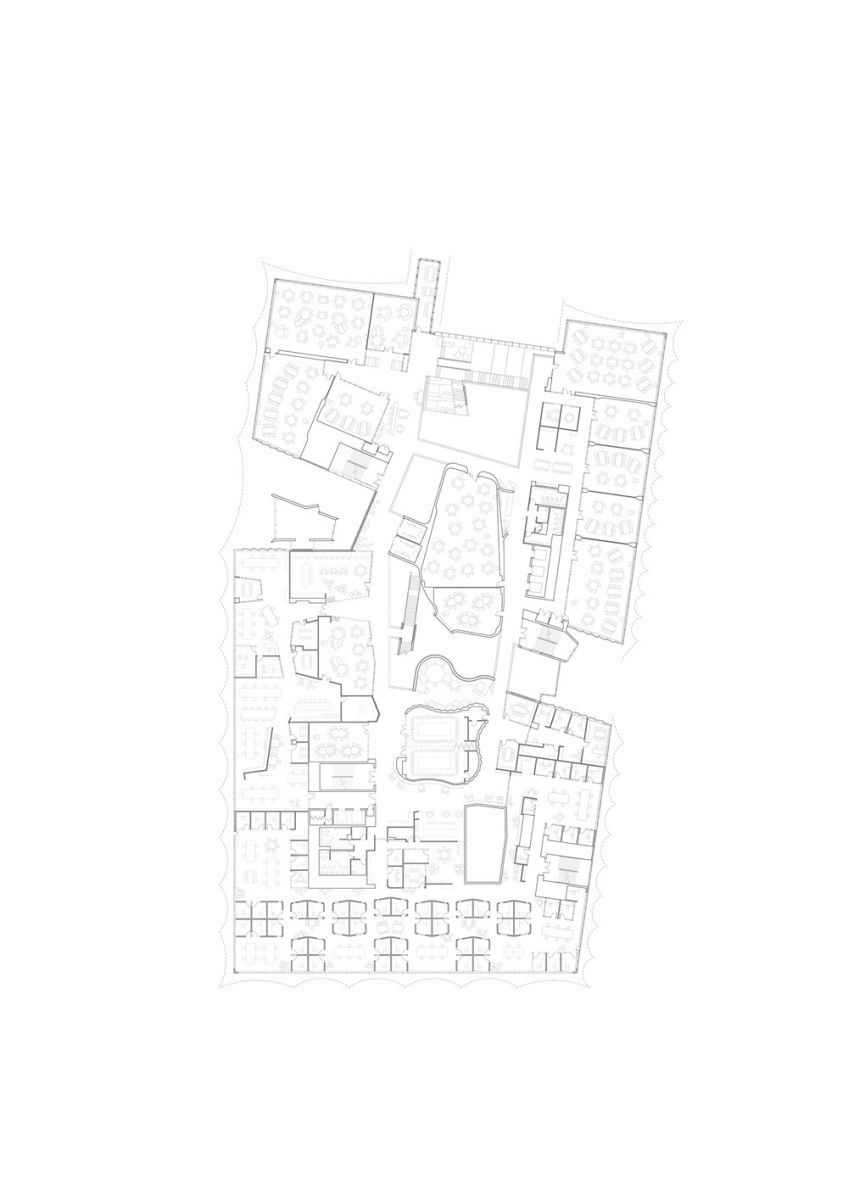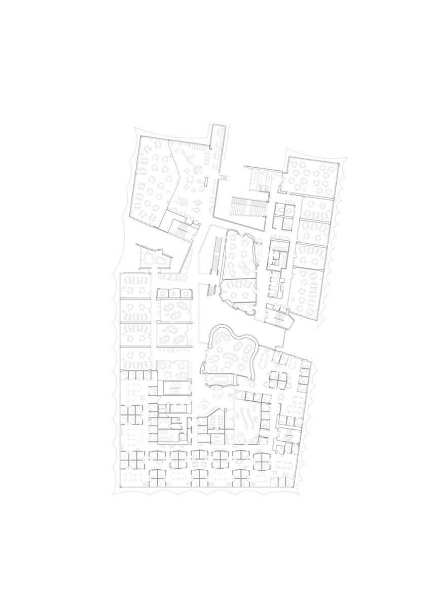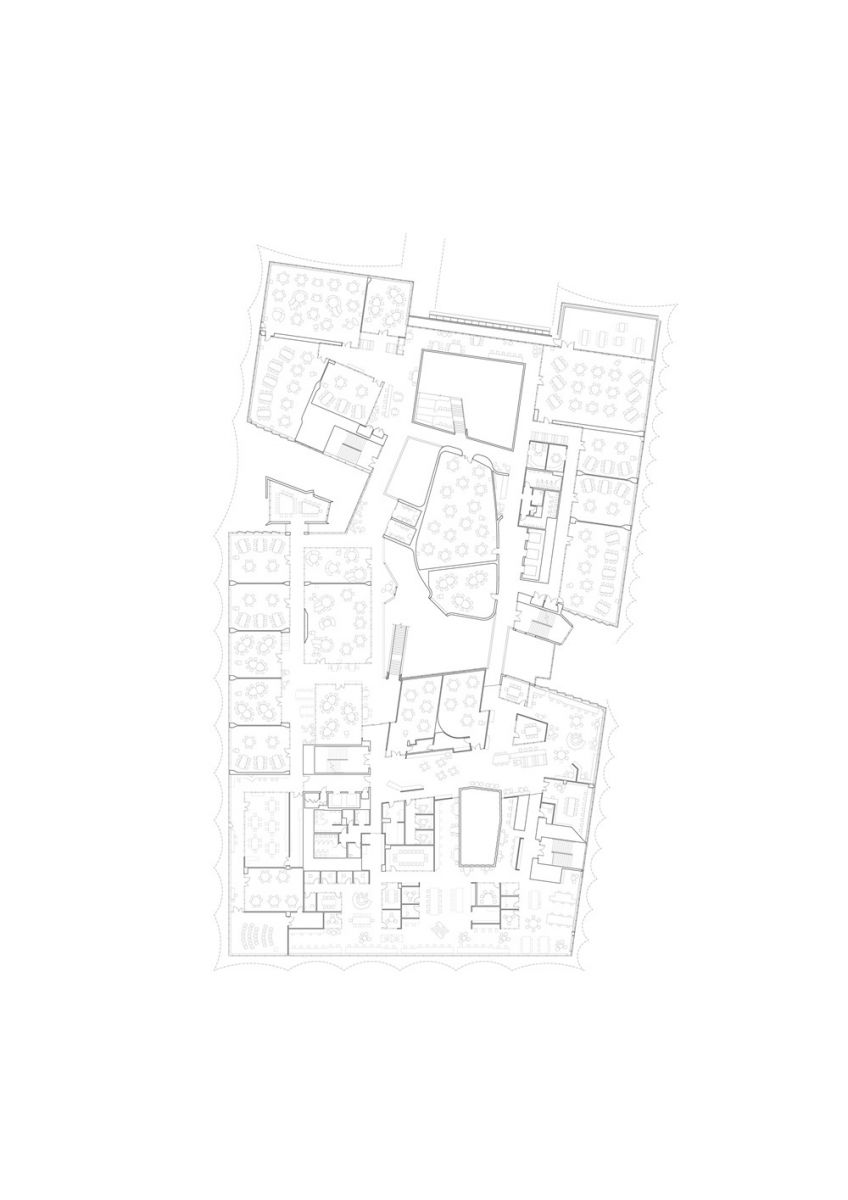 平面圖的中心是一個(gè)鋸齒形的屋頂,將南面散射的光線引入到內(nèi)部。 菱形天窗的圖案將建筑物的公共空間與來(lái)自上方的自然光連接起來(lái)并結(jié)合在一起。