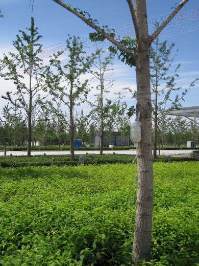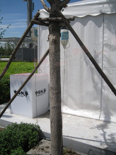 位于奧林匹克公園中心區的綠地是園區開放后各國游客觀光賞玩的一個重要景點,“中國故事”大型文化活動展示區也安排在這里,30座祥云小屋散落在這片樹叢之間,當記者穿梭于不同省份的祥云小屋之間時,突然在旁邊的樹木上發現了新鮮事兒,不少樹木的主枝干上掛著一個塑料的吊瓶,下面連著一根長長的靜脈注射針管,起先記者還以為是這里的工作人員勞累過度,掛完了吊瓶擺在這里等著回收,后來仔細一看,才發現這根長長的針管一直延伸到離地不遠的樹干底部,連通一個金屬質地的針眼,抬頭一看,這塑料吊瓶上赫然寫著“營養液”,原來是這些樹木在接受吊瓶“治療”。