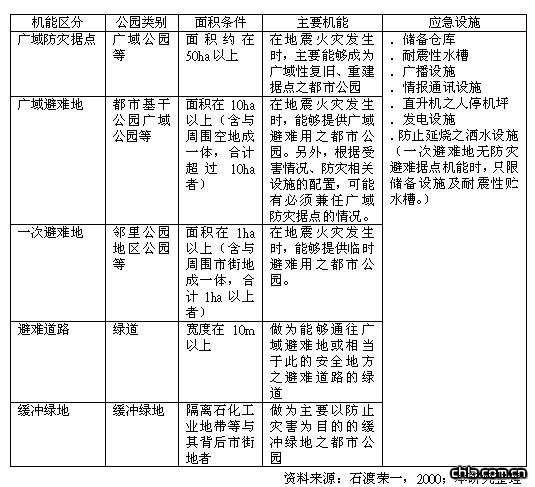 防災(zāi)公園并非只有在災(zāi)變時(shí)才能被利用,而是依據(jù)都市公園配置計(jì)劃所建設(shè)出來的一般都市公園,平時(shí)作為一般公園而在災(zāi)害發(fā)生時(shí)具有前述般明確的機(jī)能,且能因應(yīng)災(zāi)變的公園。對應(yīng)于防災(zāi)機(jī)能,公園綠地種類及其相關(guān)要項(xiàng)如表7。