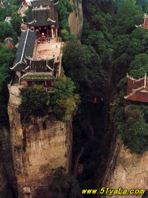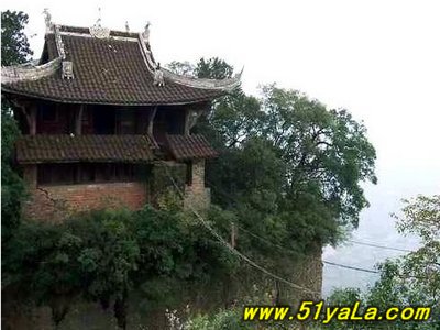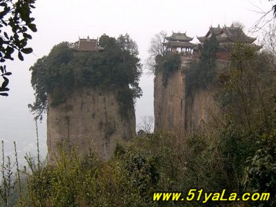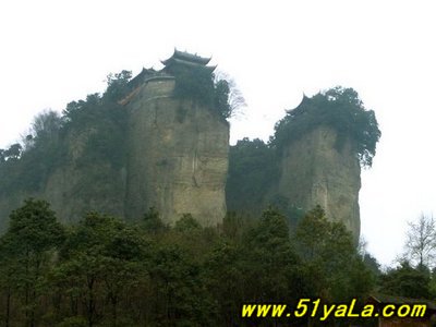 山顛三峰,拔地而起,高逾100米。峰頂各有古廟一座,名東岳、竇真、魯班。三峰之中惟一峰有險(xiǎn)路可通,其余兩峰由上下兩根鐵索組成懸橋相連。峰下不遠(yuǎn)處為云巖寺,始建于唐,明末焚于兵火,清雍正三年(1725年)重修。寺前 山門(mén)外有唐李白題贊圌山石碑一通,謂:"樵夫與耕者,出入畫(huà)屏中。"